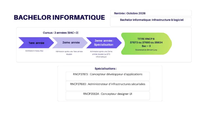 La troisième année Bachelor (Spécialité Informatique de Gestion - SIG), idéalement réalisée en alternance, vous permettra d'approfondir vos compétences en conception et développement logiciel, en y intégrant les concepts de sécurisations (DEVSECOPS) et de déploiements automatisés (DEVOPS).